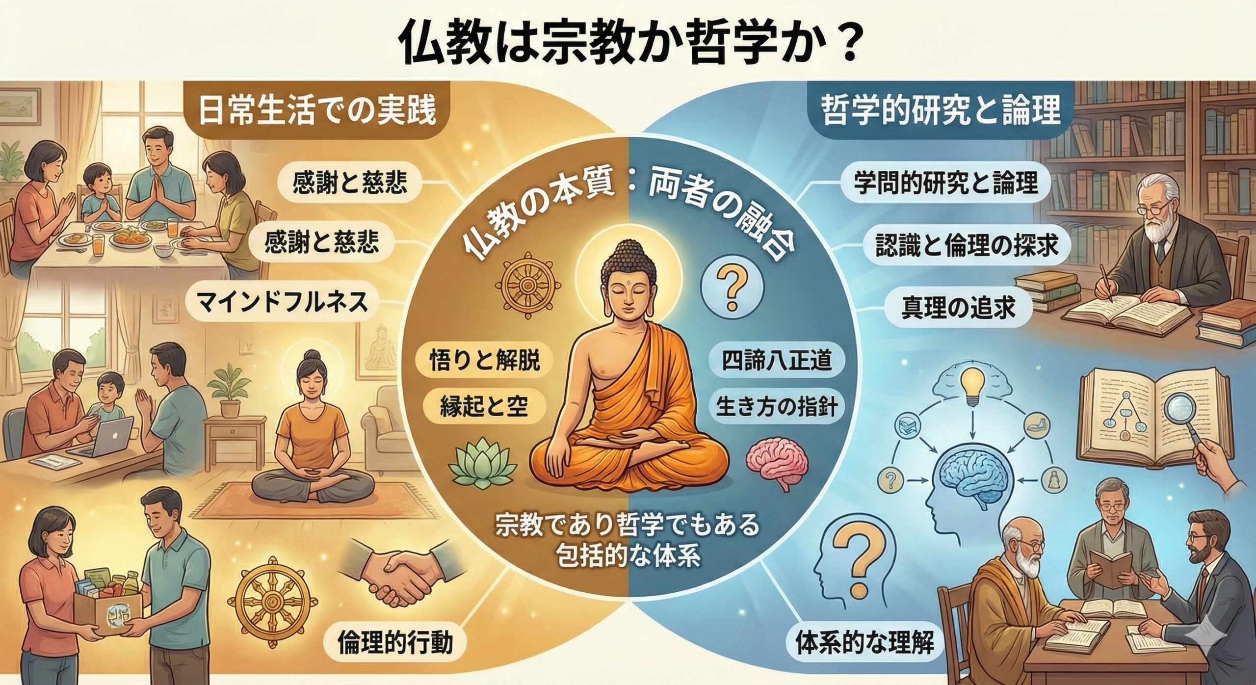 この記事では、「仏教は宗教なのか?哲学なのか?」という疑問から出発して、仏教の本質についてお話ししてきました。